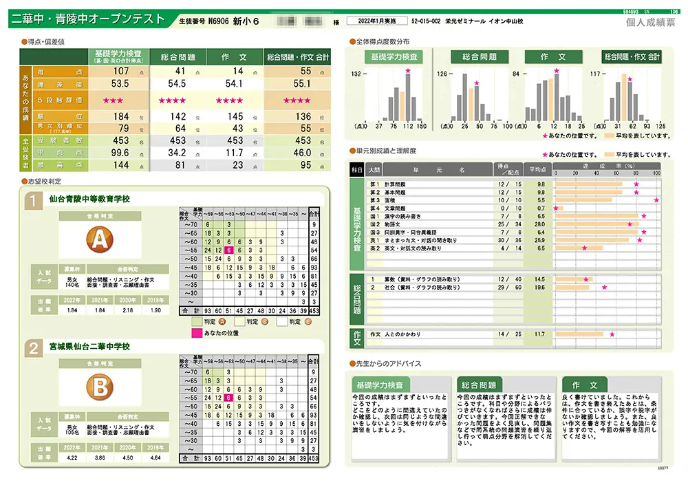 複数校の合否判定もわかるテスト結果は、面談にて返却します。二華中・青陵中・黎明中対策のプロフェッショナルが、一人ひとりの答案を分析し丁寧な添削・採点を行います。今後の学習課題や対策が明確になるとともに、志望校選びの指針にすることができます。