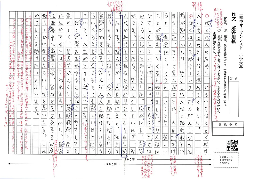 設問に合ったテーマ・構成、適切な段落数でまとめられているか確認し、作文を書き始める前に段落構成を考えるように指導します。